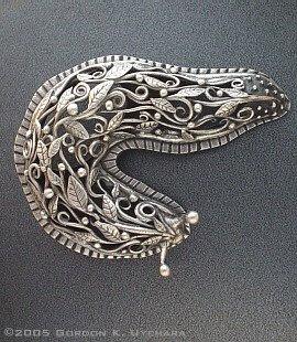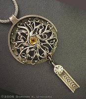 Why "2"? Well, this second piece came to be while writing a step-by-step article for Art Jewelry Magazine (Sept. 2005) based upon the original Sun Garden Sanctuary medallion. Initially, my intention was to make the vines more robust. However, I became more adept at making coils, so I inadvertantly made them more delicate. At least they are no doubt more refined.