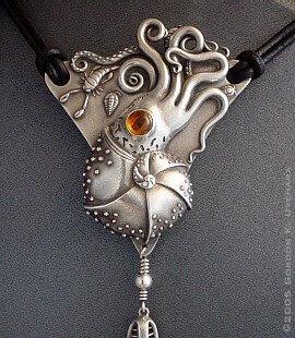Ancient Life is a silver clay creation with eight arms (or legs) and a 6mm amber eye. Undeniably, it is a stylized version of something that might have existed, not necessarily anatomically correct. Along for the ride is a stylized sea scorpion and some stylized trilobites. A spiral pendulum hangs beneath. Ancient Life was awarded second place in the 2005 Saul Bell Design Award Competition (PMC Category).