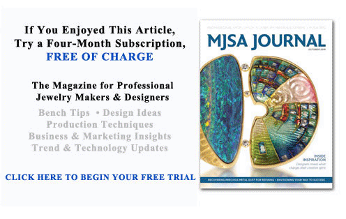 The award-winning Journal is published monthly by MJSA, the trade association for professional jewelry makers, designers, and related suppliers. It offers design ideas, fabrication and production techniques, bench tips, business and marketing insights, and trend and technology updates—the information crucial for business success. “More than other publications, MJSA Journal is oriented toward people like me: those trying to earn a living by designing and making jewelry,” says Jim Binnion of James Binnion Metal Arts.