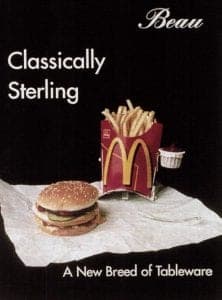 Beau's works encourage the viewer to consider the complexities of class and consumer demand marketing. The artist developed a series of bogus advertisements after realizing there was a need to educate the viewer about proper use of the utensils. When seen in a traditional museum/gallery context, the objects are installed next to their corresponding advertisements. Beau's "New Breed of Tableware" maintains the elegance and formality of an antique silver tea service and contributes to the contemporary cultural dialogue. It is refreshing to see a female artist abandon the all too typical thematic implications associated with broken hearts and ovaries in favor of an approach laden with wit and irony.