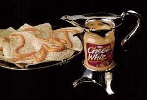 The works of metalsmith Meredith Beau shed light and offer commentary on this curious cultural phenomenon. Beau creates eating utensils inspired by the types of food typically eaten today. The artist claims the wealthy are just as likely to eat Cheese Whiz as are other members of society. By producing food specific utensils like her Cheese Whiz Server in expensive and socially charged materials such as sterling silver Beau enables wealthier processed cheese food lovers to subtlety distinguish themselves from the masses.
