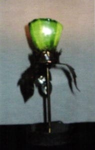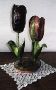 After I made several tests with hollow mesh as petals to form a flower, I realized that I could not cut the mesh because it was difficult to place it in the trivet and take it to kiln; there was a mark left where it rested and it easily got deformed. So I tried to cut a rectangle that I work with my fingers till it takes the shape of a petal and leave the remainder angles. With humid but thick enamel to which I add some drops of adhesive, I cover it with the help of a spatula and sift it immediately to reinforce the enamel coat before it dries out. I make this by sections to diminish the falloff humid enamel (photo 7). Afterwards I turned the petal and did the same thing on the other side, which needs less quantity of enamel. And, at last, in that same face which is the internal part of my petal, I reinforce the borders with a paintbrush to obtain a better finish and at the same time, a higher resistance to the borders. Now, it is ready to kiln with only the angles without enamel resting on the trivet (photo 8).