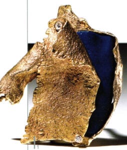 The sculpture or the image within which the jewelry is integrated as a part of the overall work and from which it can be removed for it to be worn combines various demands placed in art and jewelry. An object may hang on the wall as an elaborate eye catcher. From the center, gold, gemstones or other materials shine out over the viewers. This centerpiece can be removed and worn as a brooch. In this case, the jewelry is not damned to remain stuck in its box or in a safe and only to take effect on the occasions it is worn. It is instead present all the time.