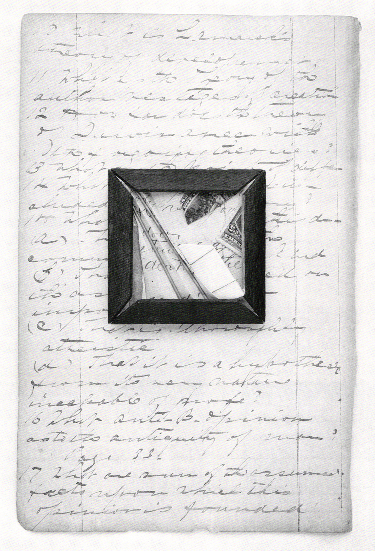 Some of the most successful assemblages that Ebendorf created were done for an exhibition at the Heller Gallery in New York in 1982. The diversity of his experiments - flat, graphic presentation; nonprecious jewels; constructed containers; illusion, transformation; dialogue—were orchestrated into serial compositions of poetic clarity. One powerful metaphoric refrain was once again of the artist as scribe.