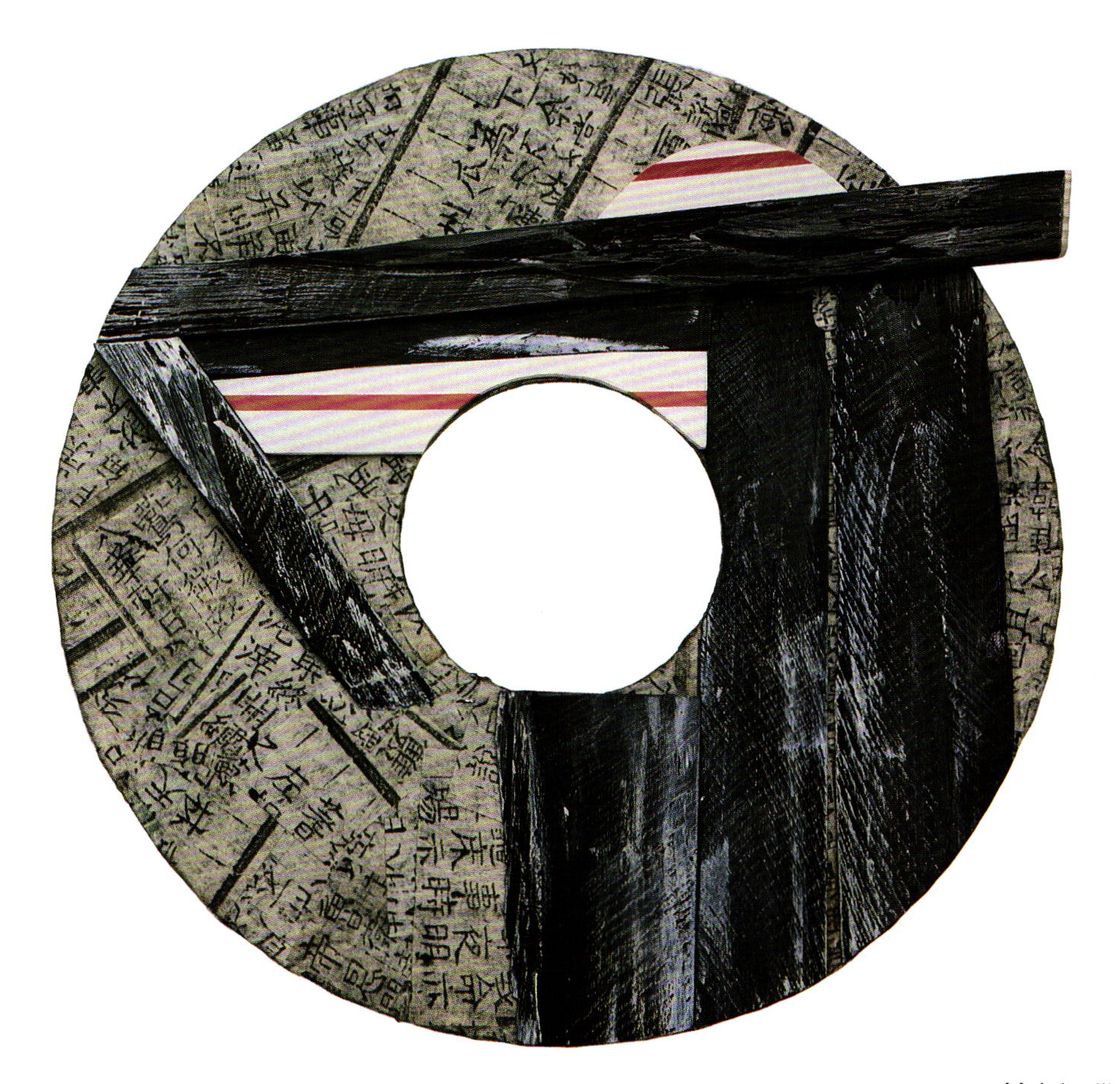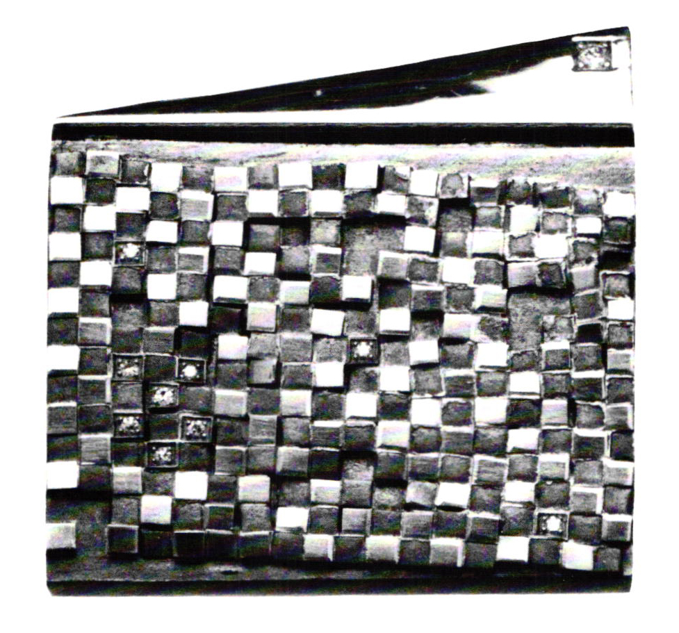 In his work, Ebendorf's first breakthrough was the shedding of the idea of raising form, the three-dimensional manifestation of metal in holloware, so important to the Scandinavian Modern esthetic of his training. Instead, as seen in the 1967 wall assemblages, his work has been overwhelmingly flat, organized to be "read" as if it was a printed page. His predominantly rectilinear formats are covered with layers and multiplicities of material, like the texture of an illuminated manuscript. To further the analogy, Ebendorf frequently uses paper in his amalgams, from old journal pages to gold foil to Oriental newsprint.