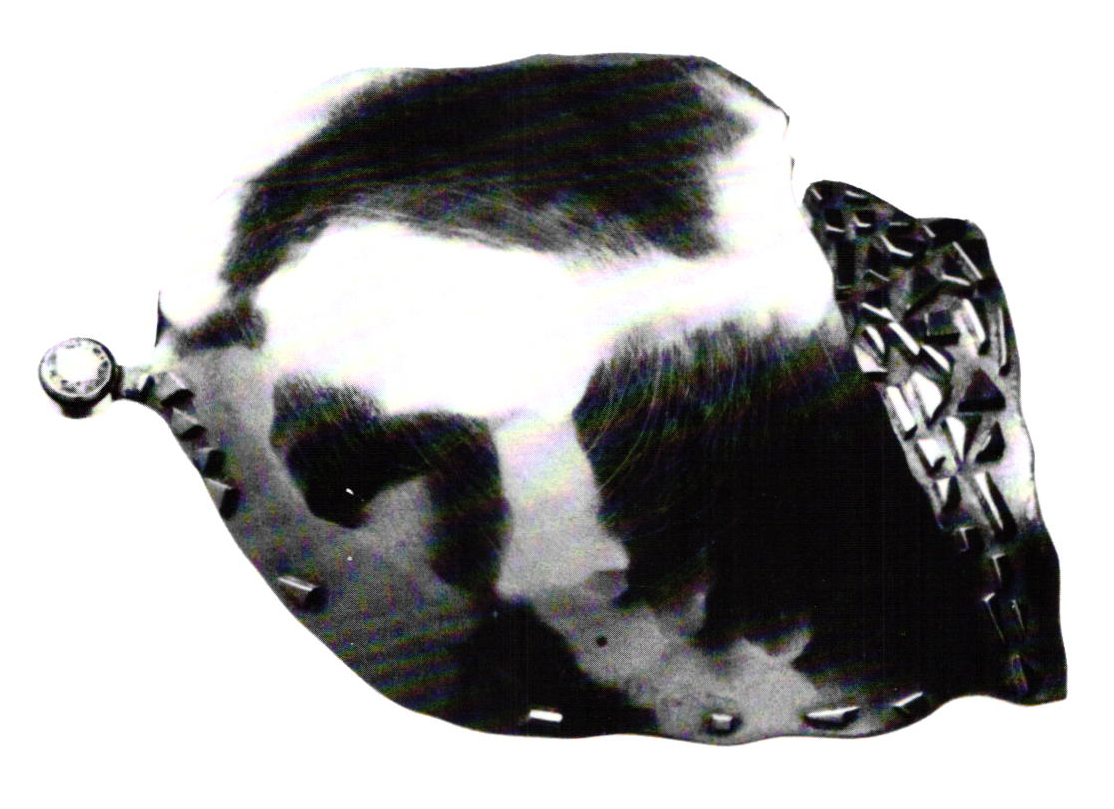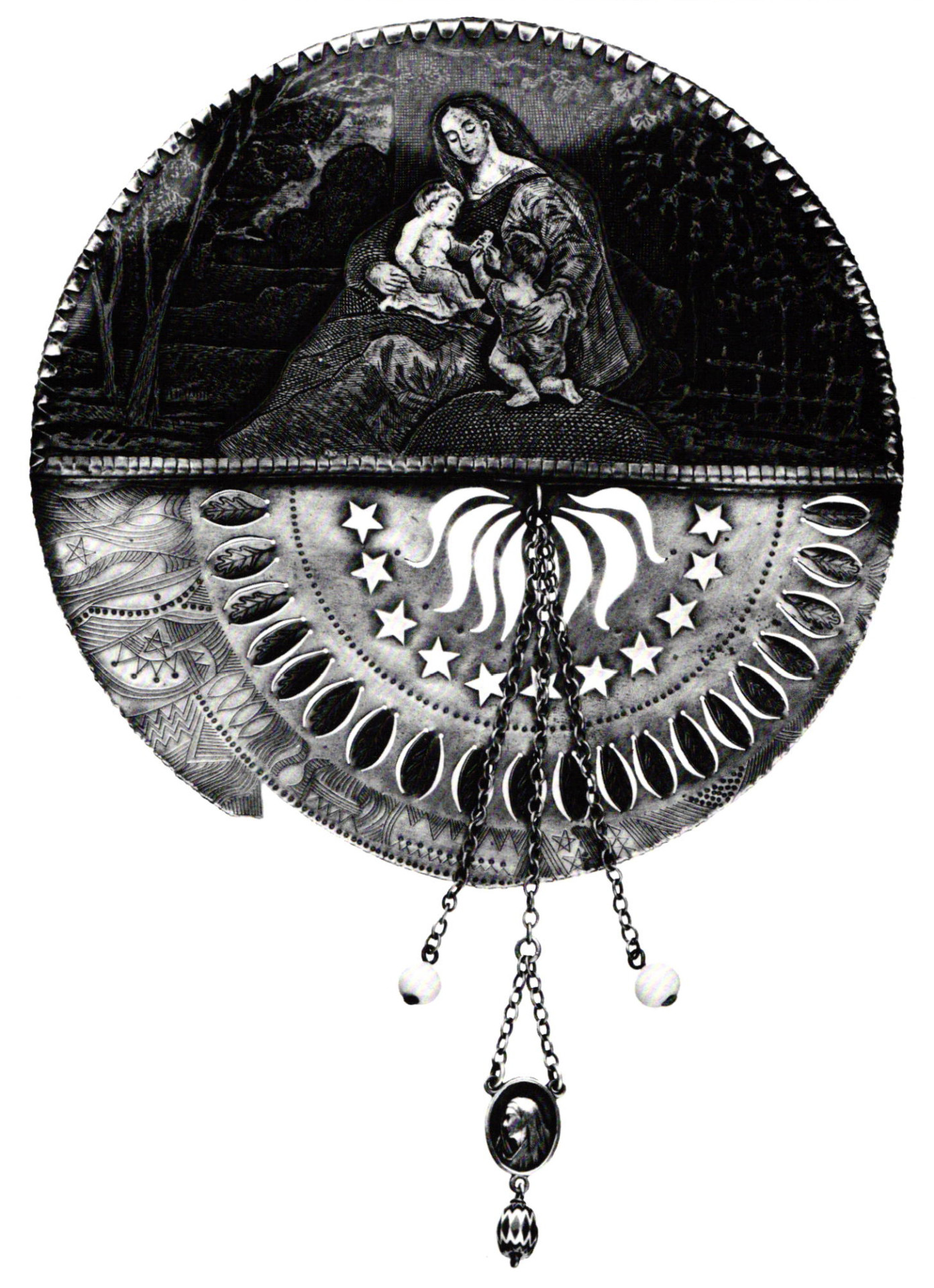 Pop Art was a great releasing mechanism, not only for painters and sculptors but also for metalsmiths like Fred Woell, Ramona Solberg and Ken Cory. The recycled, collaged sensibility of Pop also appealed to Ebendorf, who combined old tintype photos, metal scraps and found metal relics with cold connections to fashion his discourse. At the time, it seemed that this collaging had more to do with the sociopolitical climate of the day than with a truly personal statement about the meaning of these objects. On the other hand, the impulse to decorate, to personalize through surface embellishment, was also a strong draw for the energetic artist. Ebendorf turned out many pieces with repetitious, scribing notations, weaving together these seemingly disparate images and materials to form the substance of his visual texts. It is as if these markings, these personal gestures, etched into the anonymous and unrelated fragments, provided the transformational ingredient to turn junk into jewel. Most often this embellishment is an organic scrolling of repeated forms that makes a delicate tracery on a section of a metal "page."