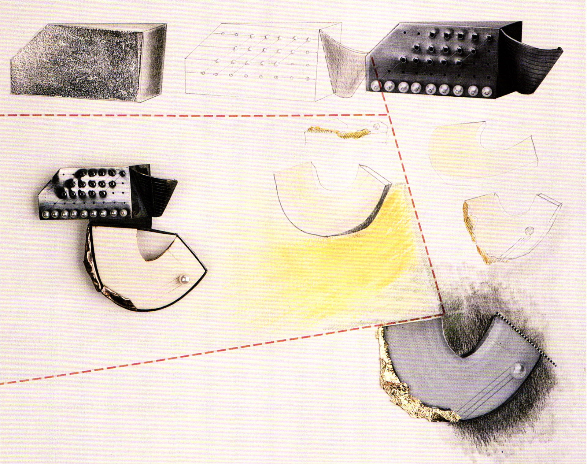 The fascination and involvement with dialogue is explored in the 1973-74 series called Colored Smoke Machines. During this time, Ebendorf began building a close relationship with Claus Bury. It was this German jewelry artist who introduced him to the European practice of exhibiting working drawings beside finished pieces. This had enormous appeal to Ebendorf, who wanted to give his viewers as much information about his thought process as possible, to develop a rich dialogue. He momentarily left his flat arena in favor of impeccably crafted, constructed or hammered enclosures of gold and silver, plexiglass tubing, bonded acrylic sheets and pearls. But he refused to abandon the page. He began incorporating a large, elaborately finished "working drawing" into many of these presentations, placing the finished piece judiciously atop the drawing as the three-dimensional conclusion to its backdrop. He played extensively with these sheets, sometimes suggesting they were an architectural plan and elevation, and with others going to great lengths to collage bits of drawings as though done at different points in time. They are finely rendered blueprints for the viewer and a means for the artist to reach out and directly speak to his audience.