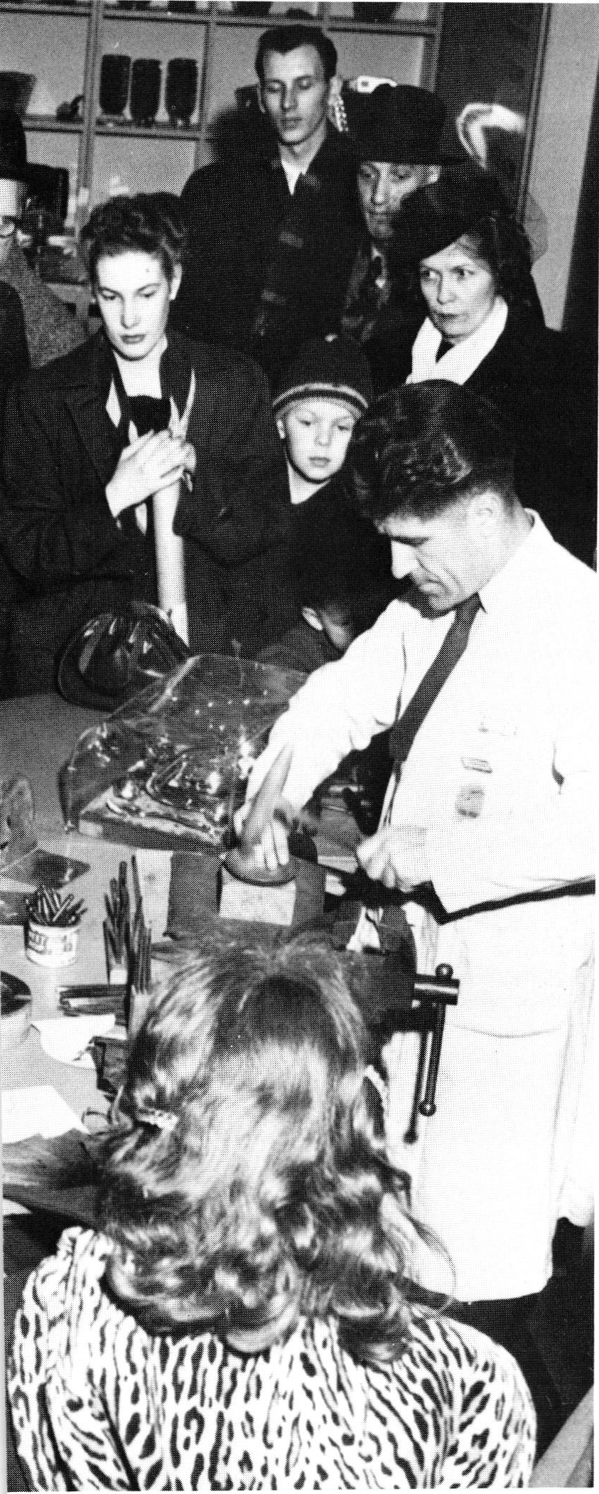 The first meetings in the 1940s featured "lantern slides," "a good old method of gilding on sterling spoons with linen ash" and talks by British potter Bernard Leach and Danish craftsman Bent Christophersen of Georg Jensen. "Coffee and daintees" were served for refreshment. Since then, the monthly Friday night meetings have run the gamut as the MAG executive strove to find interesting speakers and cull technical expertise from among the membership. Everyone knew that a promising speaker meant good attendance and hundreds have turned out on snowy Toronto evenings to enjoy and learn from such well-known craftsmen as Mary Ann Sherr, Bill Newman, Bob Ebendorf, Christel Klocke, Jamie Bennett, Hero Kielman and Lois Betteridge. Other meetings have been good forums for exchanging information on tools, techniques, marketing, design, photography—literally every aspect of metalwork.