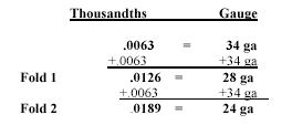 Metal thickness is doubled (or tripled) if you decide to process folded metal. It is easy to see in the calculation below how the thickness increases as folds are added