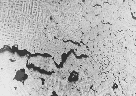 | Figure 4.42 Alloy of Au 585. Large-grained sruture, seen cracking during early forming. V=125 |