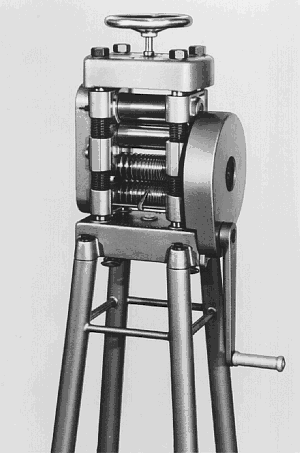 Whether a hand-operated rolling mill is suf?cient for regular use or whether it pays to have an electric rolling mill depends on the size of the business and its production program. Large production companies would not be able to manage without them. The rolling mill shown can be converted to a powered machine by mounting an electric motor into the base and constructing an appropriate power train for it.