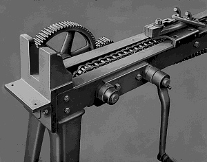 Wires over 2 mm thick will require the use of a drawbench, a device that connects the tongs by belt or chain to a large crank that signi?cantly increases leverage. For further ease a reduction gear train can be installed (Figure 4.51).