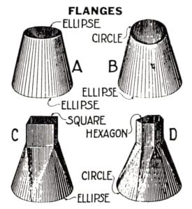 So, a study begins with an inspection of the metalworkers' trade. Technical manuals in the profession abound with plans and shaped rife with latent figuration. Figure 2 is an illustration from a 1942 sheet metal text—a learning book filled with "how-to" diagrams. Typical manual illustrations present diagrams that aid workers fabricating the practical and the functional. To the creative eye, however, these illustrations hint that the strictly utilitarian might also become decorative, expressive, sculptural and artistic.