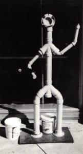 In Michigan City, Indiana, Joe the welded fabricated a vast array of figures and animals out of pipe and tank section. Joe's whereabouts today are unknown, but his sculpture can be found in yards throughout his old neighborhood. His tour-de-force is his Uncle Sam mailbox holder. Currently, it marks the driveway leading to the summer studio retreat of artist Roger Brown. In Pontiac, Michigan, Bennie Acosta built a pipe figure to grace the front of the city sewer and water building. Holding a water pail in its right hand, it sprayed water of out a nozzle fitted into its left hand. With a hat made from a dayglow traffic detour cone, Acosta's pipe man watered the plantings at the city water works. Recently, however, Acosta's "gardener" lost favor with its bosses and was unceremoniously dismantled and tossed back into the boxes of fitting from which it had originally come. Today, only a faded polaroid photo witnesses its existence.