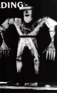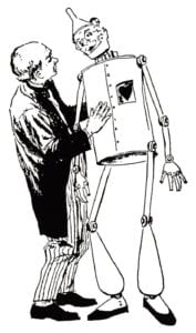 All of this would change in 1939. The concept of tin men as dandies would fade from the scene. A new paradigm would emerge from a story that had been around since the year 1900, a story that became a movie in 1939, "The Wizard of Oz." Starring Judy Garland as Dorothy and Jack Haley as the Tin Man, the movie almost instantly became American popular history (figure 7). Post-"Wizard" tin shop figures would be mechanical and whimsical in a way not seen before. In the best sense, they would formally express their essential constructivist nature as assemblages. At the same time, they would embody a spirit of fantasy and levity directly appropriated form Haley's film portrayal in the land of Oz. It is interesting to note that even the early illustrations in Baum's Oz book show the Tin Man as a rather funky, mechanical construction—complete with a metal funnel for a hat.