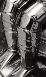 The sculptural vocabulary latent in the flange and elbow units photographed in the Rutzen-Cardon shop in Royal Oak, Michigan (figure 3) begs articulation as figurative art. Creatively considered, these units transform into feet and legs—the feet and legs of a tin man. In the mind of an artist/tradesman, the flanges, reducers, tubes, elbows and vents stocked in a shop combine and interlock to make a thigh that goes into a calf, a calf that goes into foot. A flared-box torso sprouts duct section shoulders; shoulders join tube arms; tapered forearms terminate in a tour-de-force breakformed hands. Voila! The great Chicago tin man—the 1940s Halstead Avenue tin man who should have been a Bears linebacker (figure 4).