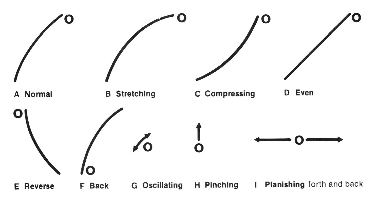 The sweep—the radial movement of the tool—is determined by the vertical movement of the tool handle. The tool rest is adjusted, so that with shoulder, rib cage and hip lowered, knees flexed and feet flat on the floor, the tip of the tool is positioned to the right of the disc against the follow block at seven o'clock. The tool rests against the fulcrum pin on the rest; often the left hand grasps this junction lightly as a way of steadying the work and providing kinesthetic feedback. As the body stretches upwards—shoulder, rib cage and hip raised, knees straightened and feet on toes—the tip of the tool drops in a shallow arc from the follow block to the edge of the disc, again at 7 o'clock. The force of the stroke is in the lateral movement, toward the headstock, controlled by the flexing of the spine that moves the ribs to the right, the movement of the hips and the unequal flexing of the knees and lifting of the feet. The combination of all these movements at different rates and amounts of force exerts the will of the spinner on the metal.