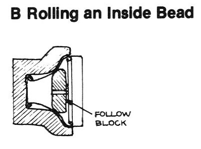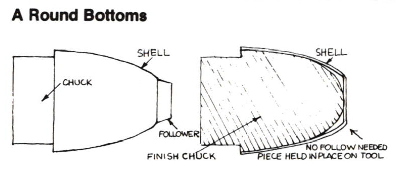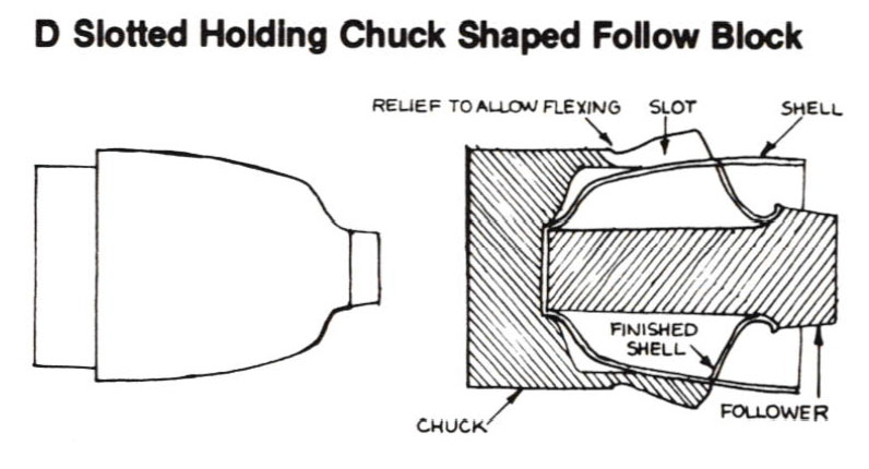 On convex chucks, it is necessary to have a concave follower; sometimes it is possible to start with a small follower, then switch to a larger one which covers most of the area already laid down. In either case, marks left on the bottom area of the shell can be removed by planishing after the rest of the shell is complete and the follow block removed. Round-bottomed forms may also be made by using a breakover chuck. Specially shaped follow blocks are used to form shells with reverse curves. The convex shape is first spun with a normal follower; then a follower which conforms to the laid-down portion of the shell and the desired reverse curve is exchanged with the first: the follow block then acts as chuck, the spinning being done towards the tail stock.