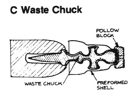 Waste, or expendable, chucks are usually made of cheap, easily formed or molded materials and are included as part of the final product. Of course expensive, finely finished materials can be used. They are used when the shell is of extremely complex design or when some property of the waste chuck itself is desirable.