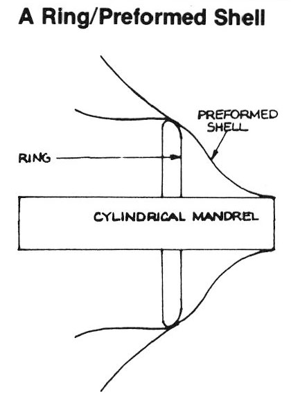 The cylindrical chuck is the most versatile when used as a mandrel. With this chuck the position of sleeves or rings can be changed during the course of the spinning to form a great variety of shells. The sleeves can be held in place with bands of masking tape on either side, set screws or a simple friction fit. One sleeve may act as a mandrel for another and may have any contour, the only rule being not to lock the ring into the shell by spinning into an undercut (unless, of course, the ring is a waste chuck). Rings can be made of an elastic material, locked in, and then removed after the shell has been removed from the mandrel. The rings act as integral backsticks to support the work in progress. The use of concave follow blocks to act as holding chucks can aid in maintaining control while using sleeves or rings (or, when the rings are removed, spinning on air).