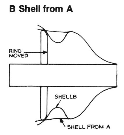 Usually the sections are held in place at the bottom by a previously formed shell which conforms to the sections up to the widest point and continues from there a straight cylinder of sufficient length to form the neck. A small ring, able to fit through the neck of the finished shell, can be used to hold the sections together at the bottom by fitting into a groove at the inner edge of the sections. This eliminates the need for a breakover chuck. Because section chucks are complicated and time consuming to make and use, they are avoided whenever possible. While several standard alternatives are available, I have designed a sleeve or ring chuck which is particularly flexible.