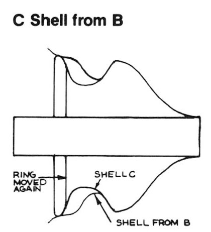 In order to form the sections from maple, they are formed all at once to the proper shape and to fit on the mandrel. The entire piece of wood is removed from the mandrel and then split lengthwise to form the sections. The key section, removed first from the shell (after the shell and sections have been removed from the mandrel), is made with edges angled wider at the center and narrower at the outer diameter. The key section must be small enough to allow for removal from the shell with all the other sections in place, yet large enough to allow the removal of the second section (which is not usually next to the key section). This limits the relative diameters of neck and belly for shells formed, although necks can be further reduced on a holding chuck.