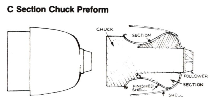 The simplest form of chuck is a plain cylinder of any depth or diameter. Next in complexity is a truncated cone, then a cone with concave or convex sides and, finally, cones with combinations of curves and straights. As with any type of mold or die, undercuts must be handled in special ways which allow the removal of the shell without locking it onto the chuck.
