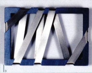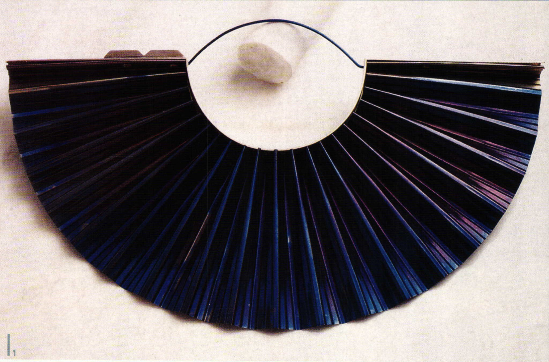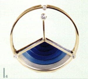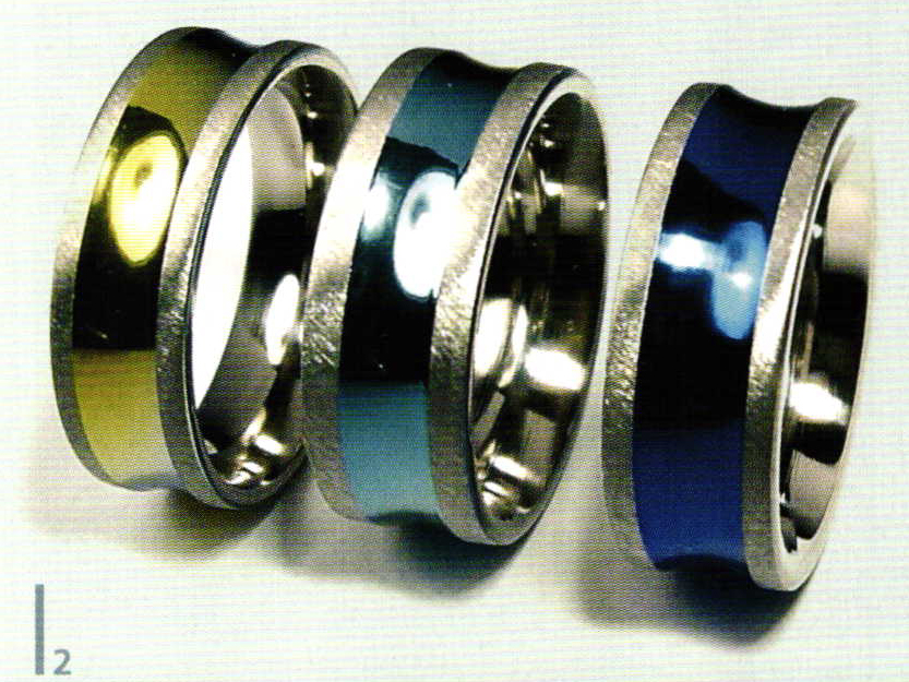 Titanium jewelry tends to be presented as the lighter and more skin-tolerant brother of stainless steel. The creative potential of the metal lies in the unique opportunity presented to color the surface by means of anodized oxidation. Reiner Brandtner and Hans-Georg Pesch caused a sensation in the early 1980s with their colored titanium jewelry. The objects stand out with their spectrum of alternating shades, ranging from steel blue to red, orange and yellow tones. It is possible to create the finest nuances and flowing transitions. The difficulty of working the hard metal means that designs are often strict of form, with added allure provided by the coloration. The two artists were far ahead of their time with their work. Perhaps the time will come where jewelry designers rediscover titanium for their works.