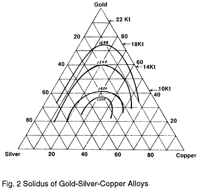 The solidus temperature of alloys must be considered in selecting a proper enamel. Considerable trouble may be encountered if the solidus temperature of an alloy is assumed to be proportional to the melting points of the individual metals used to make the alloy. The melting points of gold, silver, and copper are 19480F, 17610F and 19820F respectively, however the solidus temperature of most alloys containing these three metals is below the melting point of silver. Fig. 2 gives an indication of the solidus temperatures of gold-silver-copper alloys. Although constructed using data from a number of sources its accuracy is sufficient to illustrate the problem. 18 kt. alloys containing equal parts of silver and copper should be enameled with enamels which fire no higher than about 15000F. Lower karat alloys containing equal parts of silver and copper must be fired at lower temperatures. Thompson's Low Temperature - High Expansion enamels work well when fired at 10500F on the lower alloys.
