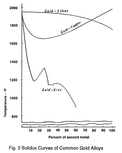 Many proprietary casting alloys contain a small amount of zinc as a deoxidizer. It also produces a fine grain casting. If the zinc additions are appreciable the solidus temperature will be reduced quite rapidly. Fig. 3 shows the rather strange solidus curve of gold-zinc alloys. As little as 4% zinc lowers the solidus point enough to prohibit the use of normal enamels used on copper. More than about 27% zinc prohibits the use of any enamel normally available.
