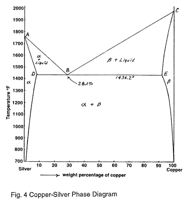Silver alloys other than sterling may be encountered, especially in the form of castings. We find no published information on the enameling of silver alloys other than sterling. This may be due to the low solidus temperature of alloys between Points D and E in Fig. 4. This also shows graphically why a problem happens occasionally when doing cloisonn? with silver wire on copper. If the silver wire penetrates the enamel and touches the copper base a melt down can occur at temperatures of about 14340F and above.