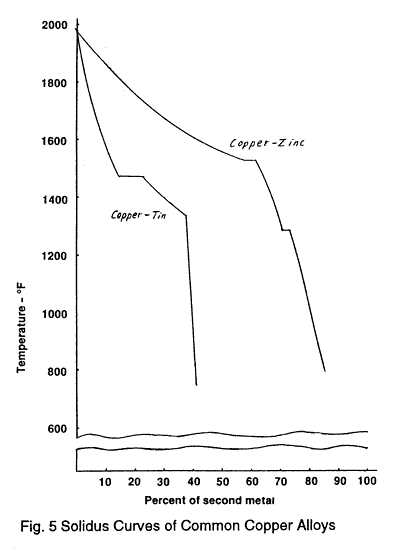Traditionally brass is an alloy of copper and zinc, while bronze is an alloy of copper and tin. In practice, it has been a tendency and nothing more. There are many examples in literature where the terms have been used interchangeably. Even today commercial bronze is an alloy of copper and zinc. In general brasses contain zinc in amounts varying from about 5% to about 45%, while alloys with aluminum, silicon, tin, and some other metals are called bronzes. Fig. 5 shows the solidus curves for copper-zinc and copper-tin alloys.