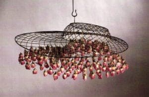 The choice of materials and the craft techniques used rupture the meanings projected by the hat forms. Wide Brimmed Hat is imbued with the most latent quality of all the headpieces. It coexists with a physical image of itself laboriously made by stringing and tying 380 dried roses (or remnants of the past). In addition to the role of the materials, the notion of "women's work" prevails along with the sweetly stale scent of the roses.