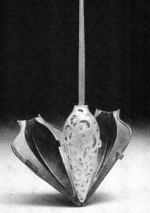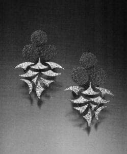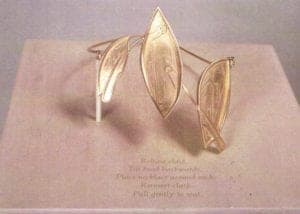 Today, the introduction of the electroformer into the metals studio has allowed the jeweler to create larger forms that are very light in weight and quite wearable. Most of my work is made with this technology. My brooches range in size from five to nine inches in length and two inches in width. I feel this size is appropriate because it suggests a relationship to recognizable forms of similar size such as a doll or a small vase with flowers.