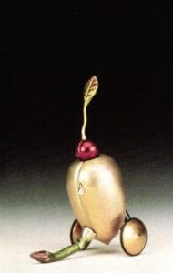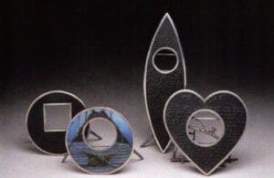 All of the pieces that I am currently working on are made of aluminum which has been lathe turned, and then carved with a band saw and flexible shaft. The pieces are finished completely, colored and then assembled.