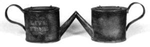 Historically the products of local tinsmiths aided directly the actual development of the colonist or pioneer and in turn the physical and intellectual establishment of the U.S.. Without tin lanterns the colonist could not see, without the tin coffee pot the pioneer could not have as easily settled the American frontier. This environment of necessity and directness of function in which American tin forms were developed not only reflected these needs but also the radical political ideas of the American revolution. "Life, Liberty and the Pursuit of Happiness" was one of the many slogans that were circulating at the rime of the Revolution and was carried with the pioneer, in their minds and sometimes on tinware, past the Appalachians.