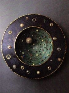 The visual language is a repetition of geometric shapes, color, and light. Geometry is used as mandala or sacred diagram (a symbolic representation of the essential, ordered structure of the universe.) This geometry is echoed in the shapes of cut and polished gem stones (amethyst, sapphire, garnet, topaz).