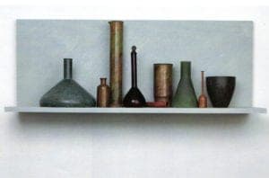 My central visual interest is in the hand-made artifact. I am most drawn to objects which seem to me to represent the simplest, most elegant expression of the idea of a kind of object (e.g., what is the 'essence of' teapot, or wine bottle?). I have used the still life format and other references to drawing and painting to make these solid, real containers seem sometimes flat and abstract, that they might be seen as representative of a class of objects as well as individual characters.