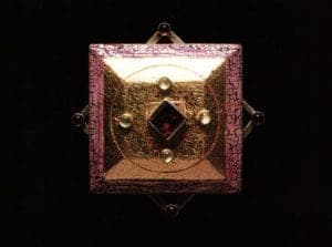 The imperfect rawness of the natural world, the cracked, rough, handled surfaces covered with color and gold combine with the perfect light that seems to emanate from cut gems. The earthly reds of garnet and transcendent blues of sapphire and iolite resonate with the golden wood to create an enigmatic vibration that is the beauty of the physical object. The sublimation or conversion of a solid substance by heat (or light) into a vapor that cools and returns to solid form is an appropriate physical analogy for the hovering between the material and the immaterial created by this mandala jewelry.
