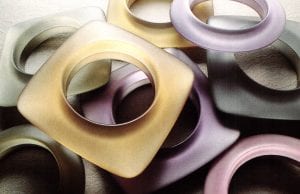 The bracelets in the top photo are cast in two parts. When the two parts are joined together, a layer of metallic pigment is sandwiched between them. The reflective pigment reflects light back out, bringing a warm luminescence to the softly tinted plastic. By sensitivity mixing muted, transparent colors, and careful hand-finishing, Campbell avoids the industrial feeling so often associated with plastic.