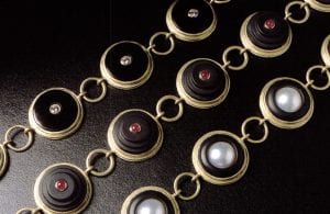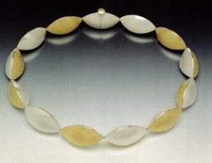 In the years since, Bunt's work has evolved in a manner often seen in the world of production jewelry. She began her career working in sterling combined with aluminum and other nonprecious materials, but as her skills and confidence grew she moved to gold and gems. When her work consists of precious materials, Bunt finds the public more willing to compensate her adequately for the substantial amount of time and care she expends in making her complex and technically challenging jewelry.