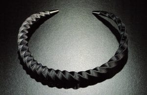 Windels's bracelets demonstrate her strong feel for engineering. Through the use of just the right temper of metal, these continuous folded forms expand to fit over the hand without losing their shape. As a result, Windels eliminates the problem of sizing.