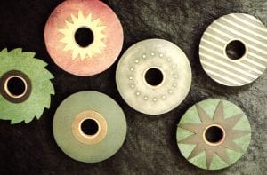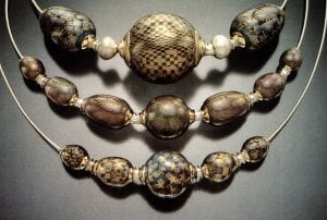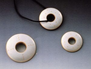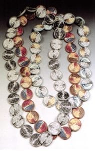 Of all the work being done in polymer clay, some of the most interesting is by the two partners of City Zen Cane. Their earlier designs were inspired by the glass technique of caning (sometimes called murini), in which threads of color are gathered into a single stick, sliced into wafers, and reassembled. More recent designs like the Coral Necklace exploit polymer clay's ability to pick up graphic images. Original drawings are transferred onto a sheet of clay, which is then baked and punched into circles, which are in turn inlaid into unbaked beads. The complexity of the process results in surprisingly original jewelry design, which can be replicated in many variations.