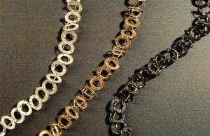 Together with her technically astute husband Christopher Hentz, Minor has developed hydraulic and pneumatic press tools to generate the deeply formed beads. The beads are strung on a cable designed and manufactured by Hentz which provides the precise degree of controlled rigidity required to present the beads to their best advantage.