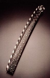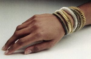Her current ribbon-like bracelets and earrings grew from her interest in making very light jewelry and from her interest in making very light jewelry and from trying to recycle metal scraps from a series of pierced spirals she was making. The springy, work-hardened forms move as the body moves and the textured surfaces create a soft, natural reflection. The broken surface provides less contrast than a polished surface. The pebbly surface also complements both skin and clothing and thus doesn't dominate the wearer. Although most of her jewelry is sterling silver, these earrings are 18k.