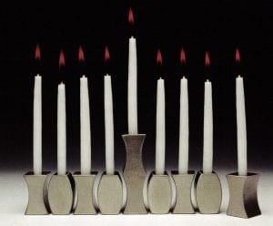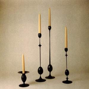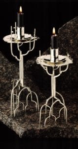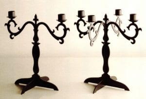 The Baroque Candelabra started its life as a model made of foamcore and cardboard. The final profile was designed in a CAD program on a Mac. The file was then reformatted for PC, and sent to a shop where it was laser-cut from cold rolled steel. Laser-cutting has the virtue of having very low setup costs, so experiments and short runs can be made inexpensively. The profiles were then finished with an electrostatic powder coating. By taking full advantage of new technologies, Doghaus can retail this candelabra for only $65.