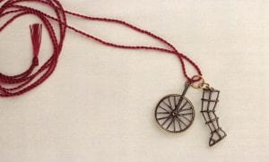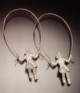 Linda Hesh says that her secret agenda is to "…get people to wear something weird." Her work is frequently based on oddball stuff she finds in flea markets, which she then adapts into jewelry designs. She generally chooses old material: cheap throwaways that have been consigned to society's junkheap, but which people also remember fondly from their childhoods. One of her most popular earrings, Double Dutch, started life as a fleamarket find. Hesh then added the jump rope/earwire to complete both the image and the function.
