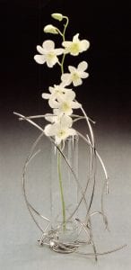 Robyn Nichols had originally hoped to be a botanical illustrator, but that field vanished under the onslaught of photography. Meanwhile, she taught herself silversmithing, first in a high school shop class and then later in art school. Her silverware combines the two disciplines. Her imagery is fairly accurate, the result of careful study. The Mangrove Candlesticks, for instance, stem from her observation of mangrove trees in the Grand Cayman Islands, where she has been teaching seasonally for the past ten years.
