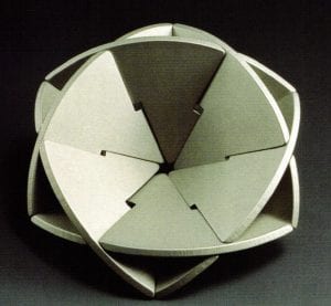 Determined to add impact to her bold patterns, Webb utilizes a hydraulic press as well as fold forming techniques to produce three- dimensional forms. She integrates the forms with the graphic patterns in a manner that accentuates and complements both. The efficiency of her processes allows her to sell what appears to be quite elaborate work for a surprisingly reasonable price.