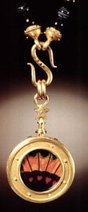 Arsenis produces a line of gold jewelry, most of which is granulated. Much of it is conservative design that recalls Greek and Roman jewelry, similar to most granulated work in the marketplace. Arsenis admits this work sells well: people seem to be more comfortable with the classic look, and usually avoid more experimental work. One such experiment is this cast and enameled pendant. The enameled pattern has the illusion of being made of colored stones, and plays off against the secondary pattern of gold granules. Both curators were impressed with this design.